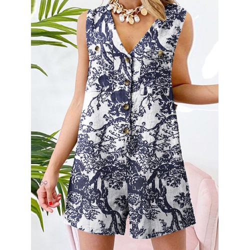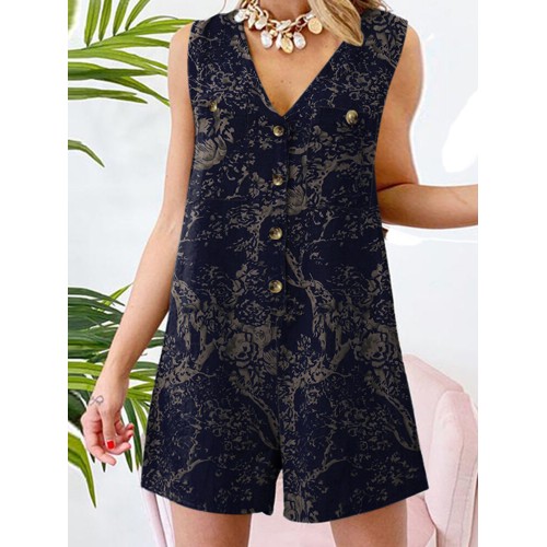 Plants Print Pocket Button Front Sleeveless V neck Romper