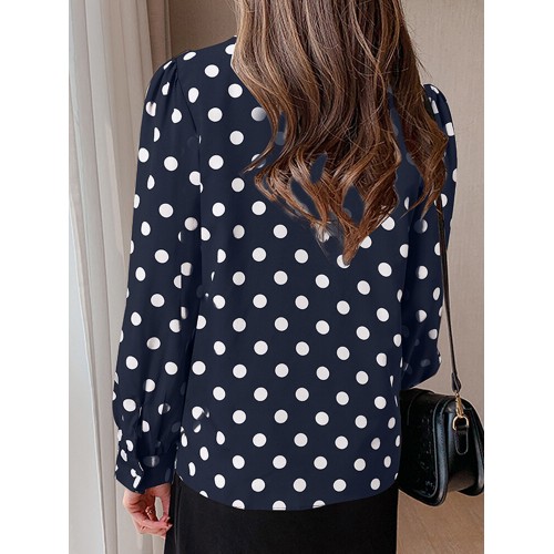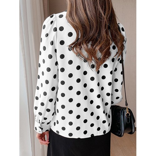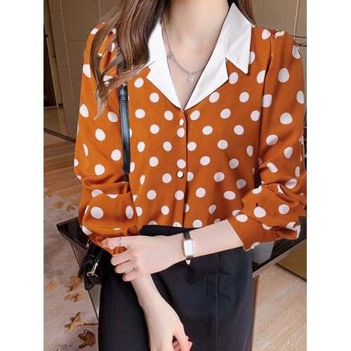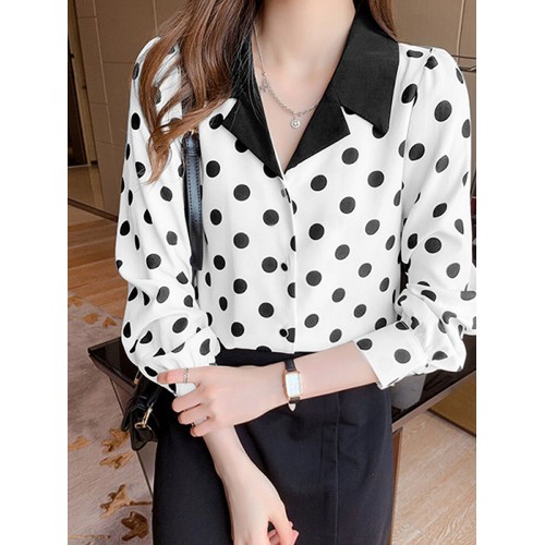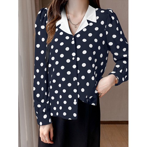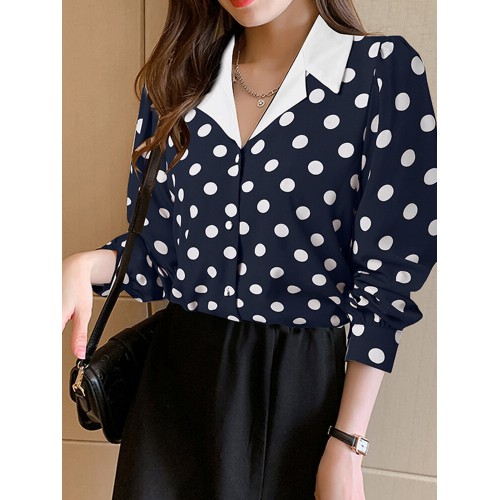 Polka Dot Contrast Color Lapel Button Long Sleeve Casual Shirt
